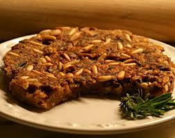 Ungete leggermente lo stampo di olio, spolverizzatelo di pangrattato, versatevi il composto e aggiungete i pinoli e l'uvetta asciugata con carta da cucina (distribuendoli sulla superficie); irrorate il castagnaccio con un filo d'olio e aggiungete gli aghi di rosmarino.