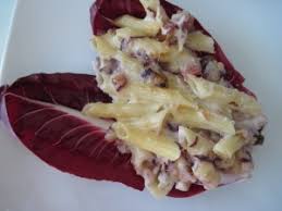 Lessate al dente le penne, conditele prima con la trevisana, poi, con la crema di gorgonzola, quindi, con la scorza di limone grattugiata; condite con sale, pepe e parmigiano, mescolate bene e servite immediatamente.