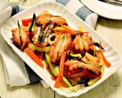 Servite il pesce ben caldo accompagnandolo con le verdure in agrodolce.