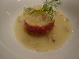 Intanto, si tagliano i filetti di baccalà a fette sottili e si sistemano in un unico strato su un piatto grande, poi si versa sopra l'emulsione (filtrata), si copre il piatto con pellicola trasparente e si lascia marinare (per una notte) in frigo.