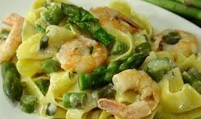 In una padella rosolate l'aglio con 3 cucchiai d'olio, unite le code di gambero (private del guscio) e cuocete a fiamma vivace per 2 minuti, poi, aggiungete gli asparagi (scolati dall'acqua), salate, pepate e tenete da parte.